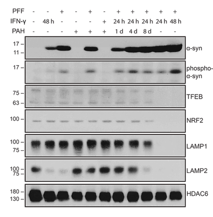 Western blot analysis shows that PFF+IFN-γ treatment reduces lysosomal proteins (LAMP1, LAMP2) and regulators (NRF2, TFEB) while increasing α-syn pathology. The addition of PAH restored lysosomal proteins.